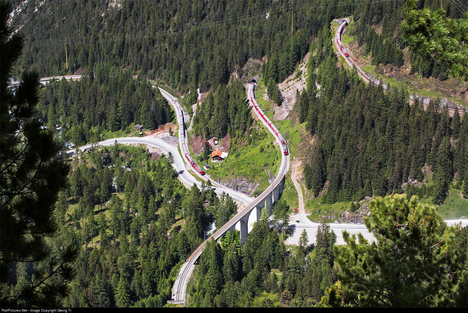 The Albula railway line is part of the RhB UNESCO World Heritage site Albula/Bernina since 2008. The line was completed in 1903 to connect the Upper Engadine to facilitate international tourism and is tourist attraction in its own right. Renowned professional engineers were called upon for the construction of the Albula line (Thusis - St. Moritz). The track routing and all engineering constructions were built according to standards that represented the most progressive practices of mountain railway construction. The Albula railway was designed as a classic mountain railway for steam locomotives. Its track routing and engineering structures made out of local quarry stone were the highlight of the classical period of railway construction. The Albula line was electrified with 11000 V AC 16,7 Hz in 1919 already, more then 100 years ago. The most spectacular section is between Bergün and Preda, with open loops, loop and spiral tunnels and many viaducts. On this photo compilation, the Interregio 1145 from Chur to St.Moritz, pulled by the locomotive Ge 4/4 III # 644 "Savognin", can be seen three times on the section between the service station Muot (1575 m a.s.l.) and Preda (1789 m a.s.l.). During 2 minutes and 45 seconds, the train climbs 80 metres in altitude with a gradient of 3.5 % through the 677-metre-long Toua spiral tunnel, over the 138-metre-long Albula III viaduct, through the Maliera Gallery in a loop and finally through the 535-metre-long Zuondra spiral tunnel. On the far left is the Albula II viaduct visible. The picture was shot from the Fallò mountain on about 2100 m a.s.l., about 1 1/2 hours hike from Preda, not with a drone!