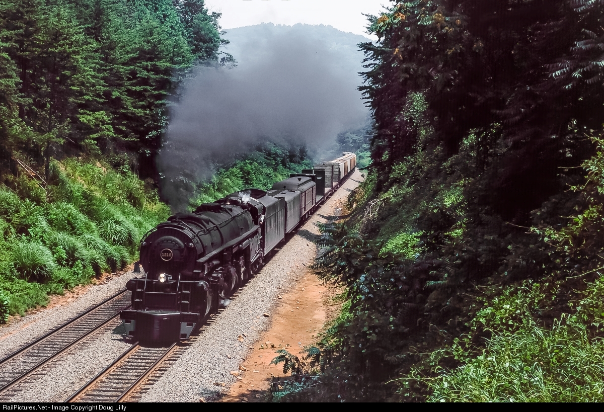 One of the little publicized aspects of many N&W 1218 excursions was what happened when the destination did not have facilities to turn the huge 2-6-6-4. On this day, the A had led a long excursion from Alexandria to Charlottesville, Virginia. While the passengers and most chasers were going north with three Southern FP7’s and the excursion train, 1218 was making a deadhead move to its next scheduled location in Roanoke. With several cars bound to the same place, the A was pressed into revenue service, as seen here at Emerson, Virginia.