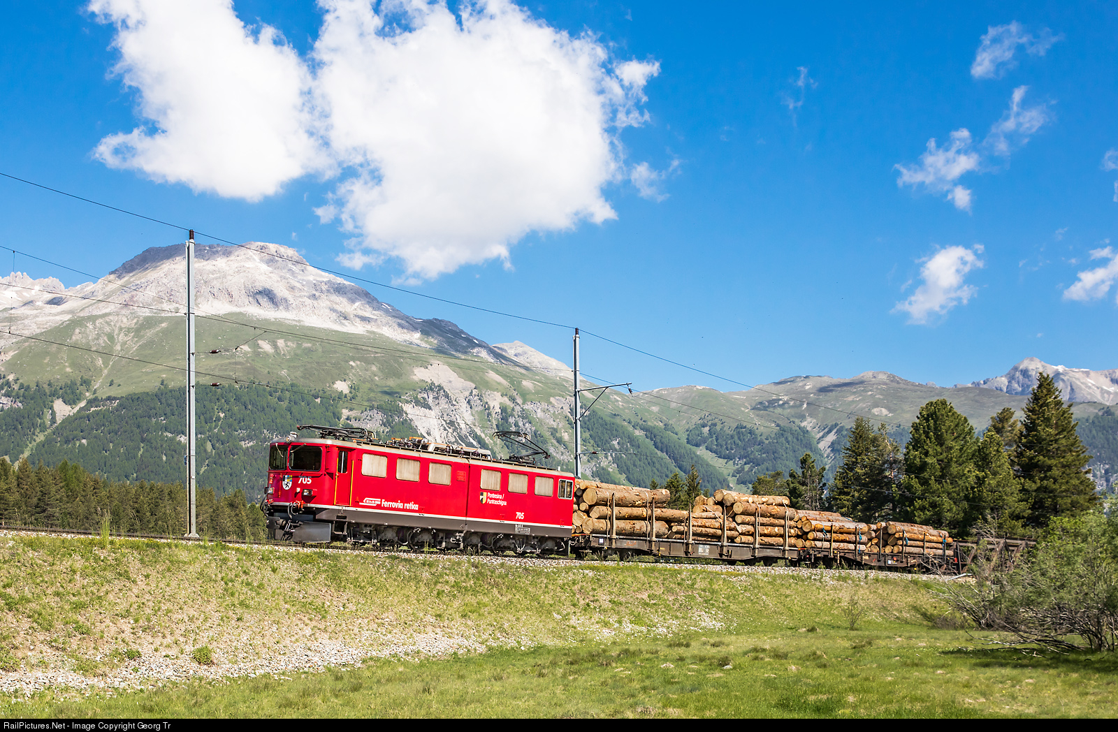 | Ge 6/6 II # 705 "Pontresina/Puntraschigna", pulling the freight train 5113 from Landquart over the Albula line to Pontresina near Punt Muragl, is only few kilometers from the village which gave her the name. |