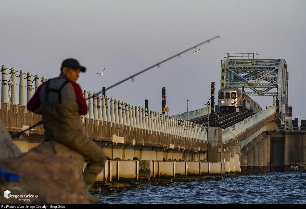 A Manhattan bound "A" train crests the North Channel Swing Bridge as a local fisherman patiently waits at the edge of Hamilton Beach for his first catch of the evening.
