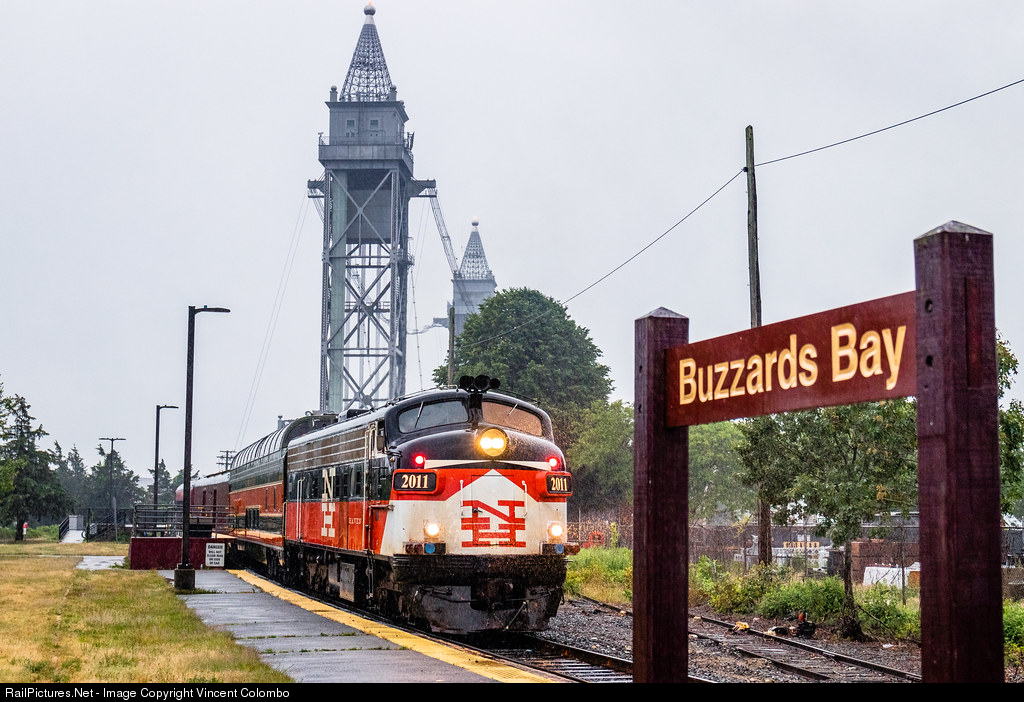 The first Cape Cod Central Dinner Train of the 2020 season occurred one of the only rainy days Cape Cod has seen in June. MC FL9M 2011 (ex-NH) passes through Buzzards Bay, MA on it's journey between Hyannis and Pocasset. The 1935-built vertical lift bridge over the Cape Cod Canal stands in the background.