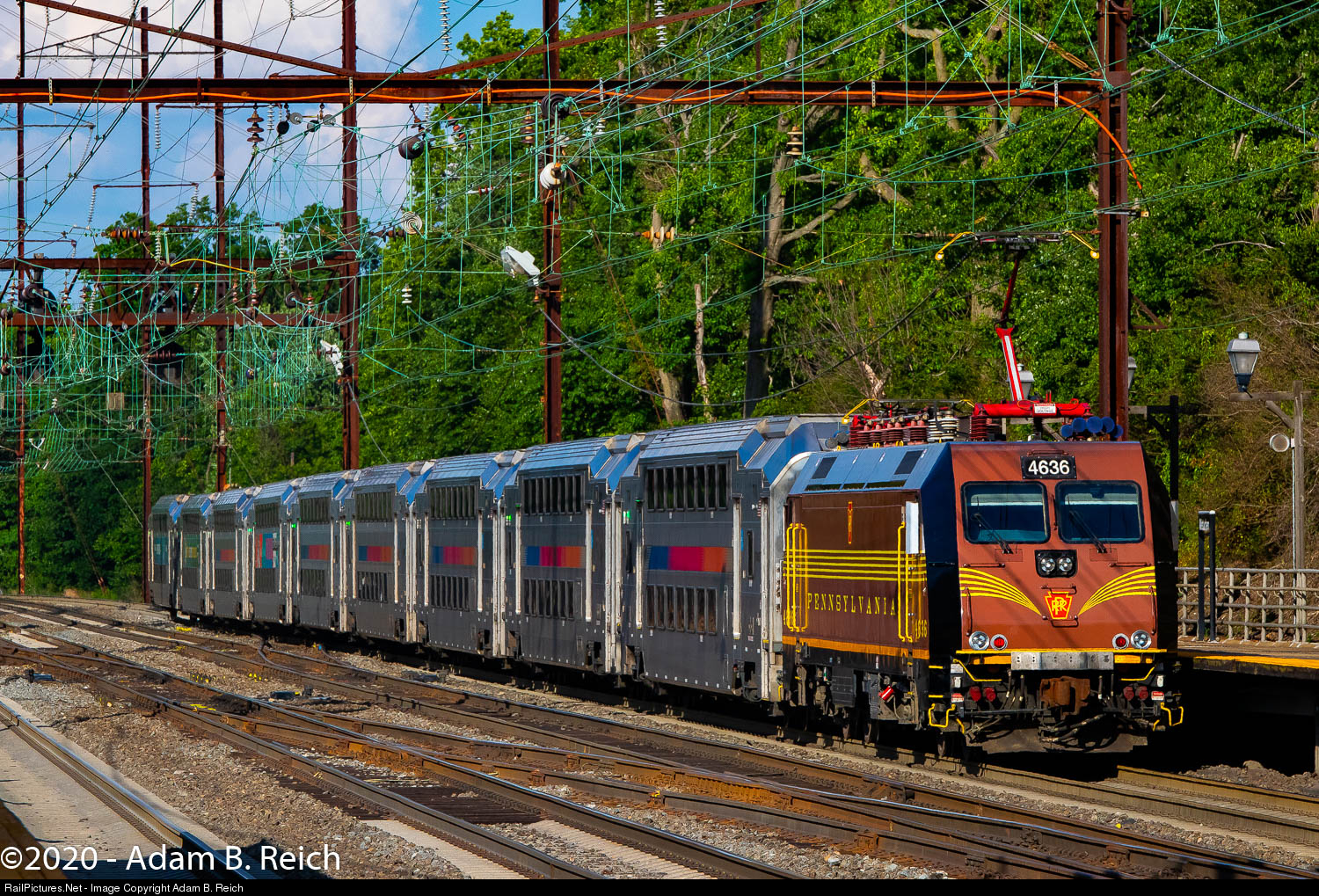 Tuscan Summer: NJ Transit Pennsylvania Railroad Heritage ALP-46A #4636 shoves NJ Transit Northeast Corridor Line Train 7852 out of Metuchen Station on a summer afternoon.