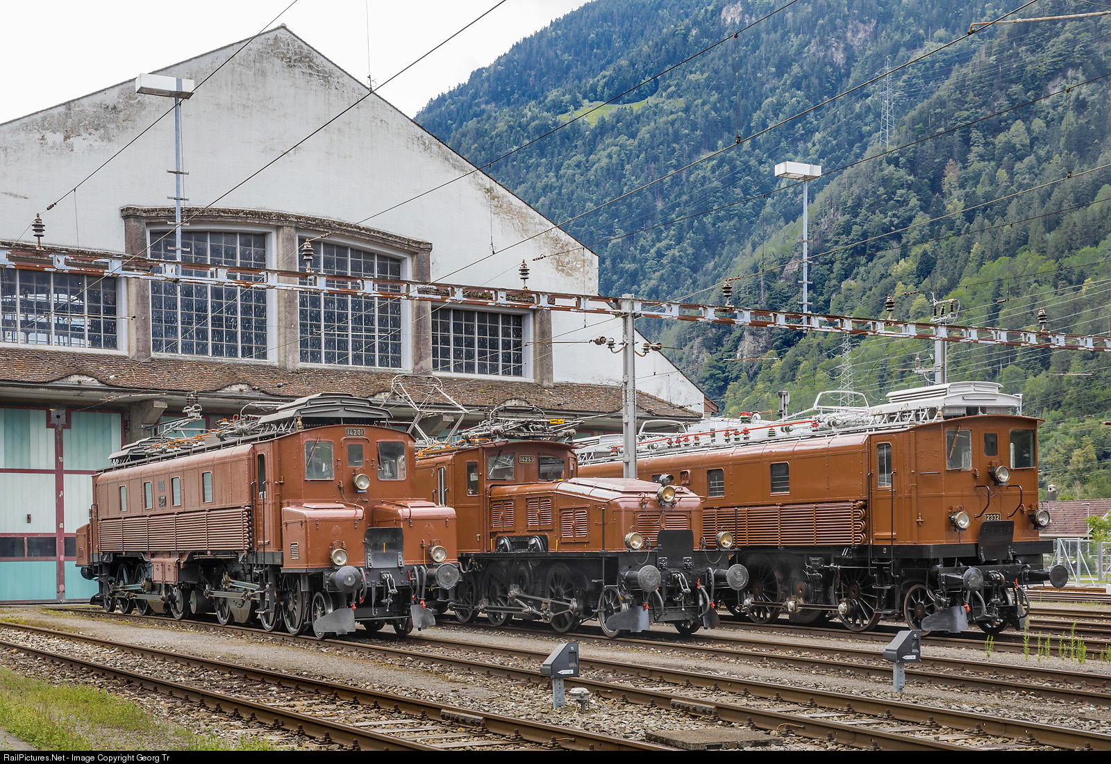 Three pioneer locomotives of the electrification of the Gotthard line about one hundred years ago in front of the depot in Erstfeld. From left to right: Ce 6/8 I # 14201, ordered from SLM and BBC in 1918 as Fc 2x3/4 # 12201, delivered to the SBB in July 1919 with designation and number of today, and first tested on the Bern-Thun line, which was electrified already. From March 1921, it was assigned to the Erstfeld depot for freight trains service on the newly electrified Gotthard line (Erstfeld to Biasca). The "Grossmutter" (grandmother) or "Köfferlilok" (small suitcases locomotive, because of the two stems at the front) has 2370 HP and a top speed of 65 km/h and was originally built as a test locomotive for later orders, but a larger number of Ce 6/8 II and Be 4/6 locomotives were ordered before the # 14201 could be delivered and tested. Withdrawn in 1982 and not operapable any more it is in the collection of SBB Historic in Erstfeld.