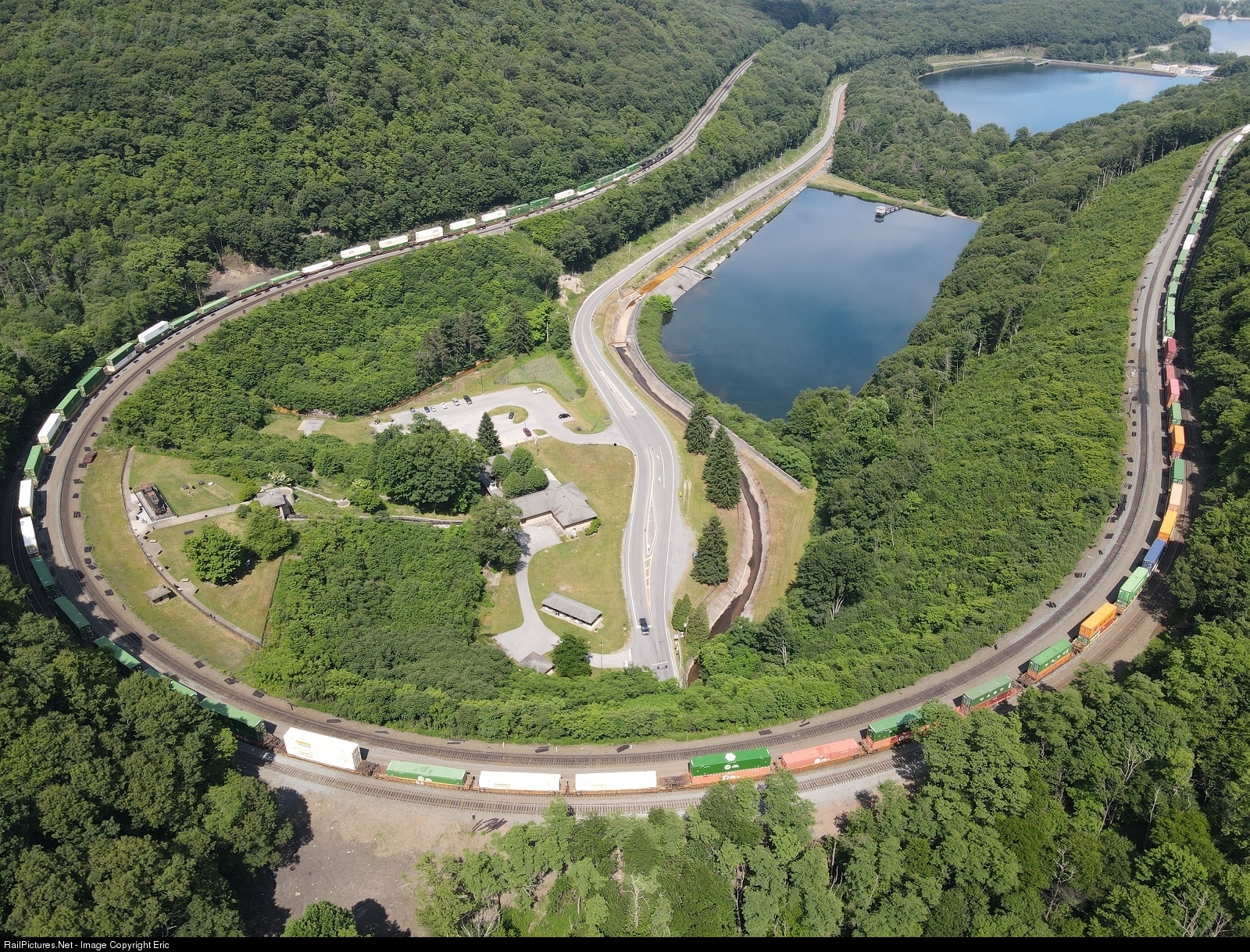 A beautiful 4th of July brings us this beautiful overhead view of Horseshoe Curve as an Eastbound container train makes it way down the grade.