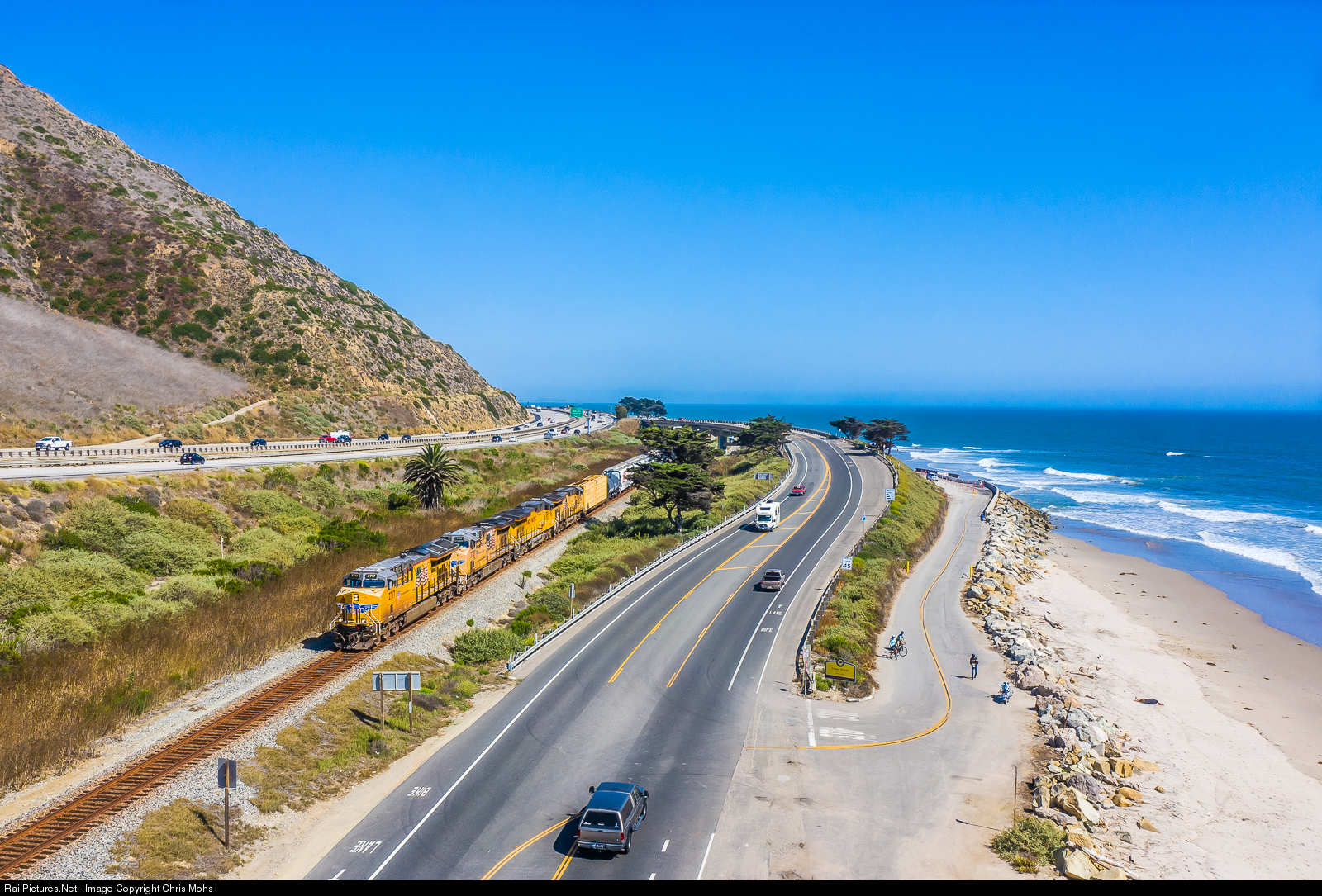 The northbound Gaudalupe Hauler with Union Pacific ET44AH No. 2717 on the point rounds the curve at Emma Wood and slips under the Hwy ! bridge. The 101 freeway on the left, the Union Pacific Santa Barbara Sub, Hwy 1 and the entrance to the State Park squeeze around the point.
