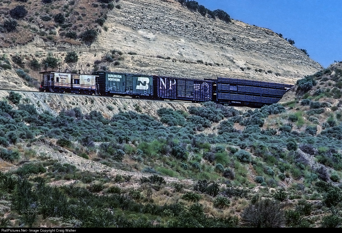 Southern Pacific’s Bicentennial caboose, SP 1776, brings up the rear of a westbound freight at Hiland, the summit of SP’s crossing of Cajon Pass. Built in December 1966, this car was repainted for the American Bicentennial in November 1975. Nearly four years later, a lot of grime from trailing long trains for so long has given this once sparkling paint job a heavy patina of dirt. (Cajon Pass, California – 06/79)