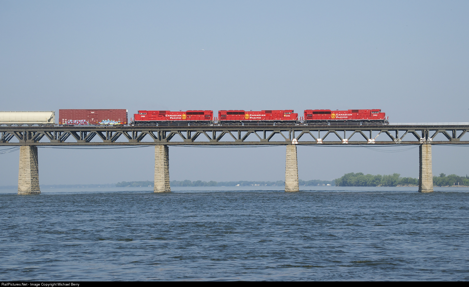| Fresh rebuilds. A trio of fresh SD70ACU's (CP 7054, CP 7045 & CP 7055) lead a 140-car CP 253 over the St. Lawrence River. They had been delayed a bit south of here when a hotbox detector on CP's Lacolle Sub warned them of a problem. |
