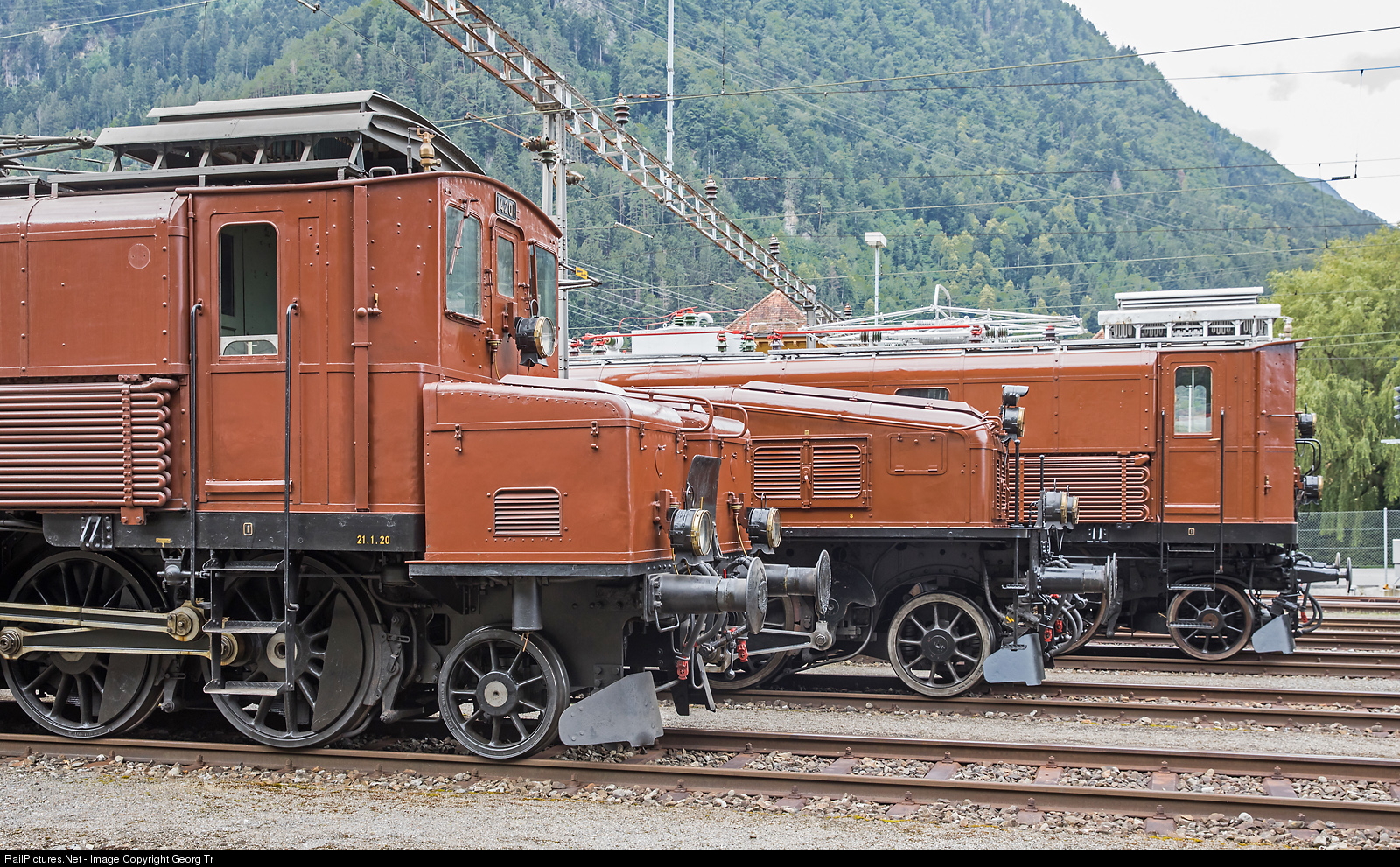 Line-up of three pioneer locomotives of the electrification of the Gotthard line about one hundred years ago in front of the depot in Erstfeld. From left to right: Ce 6/8 I # 14201, ordered from SLM and BBC in 1918 as Fc 2x3/4 # 12201, delivered to the SBB in July 1919 and first tested on the Bern-Thun line, which was electrified already. From March 1921, it was assigned to the Erstfeld depot for freight trains service on the Gotthard line. The "Grossmutter" (grandmother) or "Köfferlilok" (small suitcases locomotive, because of the two stems at the front) has 2370 HP and a top speed of 65 km/h and was originally built as a test locomotive for later orders, but a larger number of Ce 6/8 II and Be 4/6 locomotives were ordered before the # 14201 could be delivered and tested. Withdrawn in 1982 and not operapable any more in the collection of SBB Historic in Erstfeld. Second is the iconic "Crododile" locomotive Ce 6/8 II # 14253 built by SLM and MFO in 1919 and delivered to the SBB in 1920 for freight trains on the Gotthard. Initially with 2240 hp and Vmax 65 km/h, after a conversion in the 1940's then delivering 3640 hp with up to 75 km/h and designated Be 6/8 II # 13253. The locomotive has been part of the SBB Historic fleet since 1976 (with original designation and number) and is stationed operational in Erstfeld. Third is the "Roebuck" Be 4/6 # 12332, built in 1922 by SLM and BBC in a series of 40, with 2040 HP and Vmax 75 km/h for passenger trains on the Gotthard line. The locomotive is not operational any more, it was exhibited at Baden station from 1974 to 1982, then moved to the Swiss Museum of Transport, Lucerne (VHS Luzern), but had to be moved to a shed in Arth Goldau due to lack of space and is now part of the beautiful collection of SBB Historic in Erstfeld.