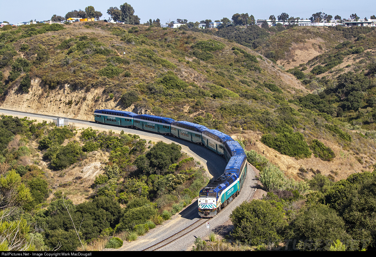Coaster 657 heads down the 2.2% grade on Miramar Hill with an F40 in the lead as they work their way towards the Pacific Coast and Oceanside.