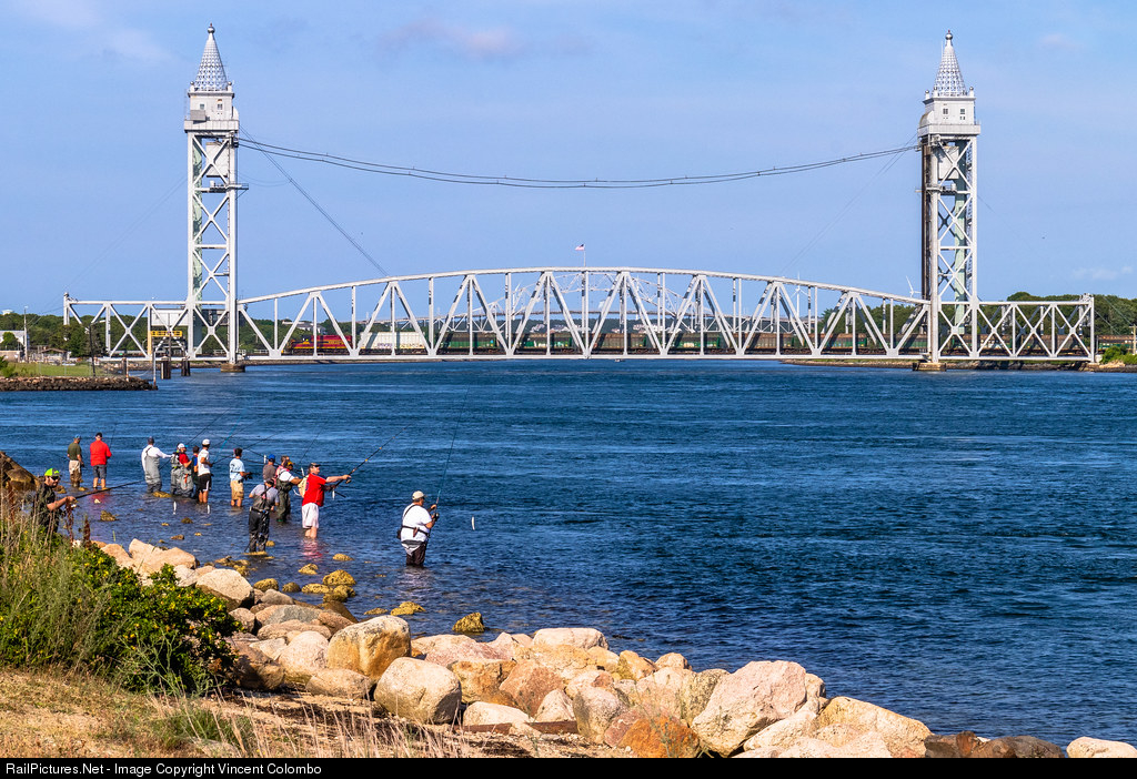 Mass Coastal 2006 (ex-ATSF GP7u) and the Energy Train cross the Cape Cod Canal as fishermen enjoy a cool dip in the water on this hot and muggy summer day.