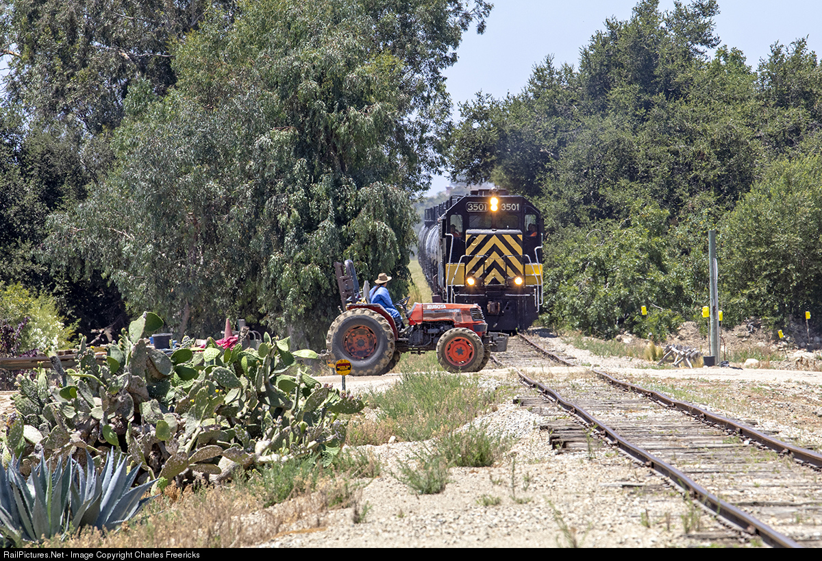 FWRY's Extra 3501 with a string of LPG tanks for storage is such an unusual move the man on the tractor had no idea to expect a train. Luckily both train speed and his quick thinking kept there from ever being a real threat of accident.