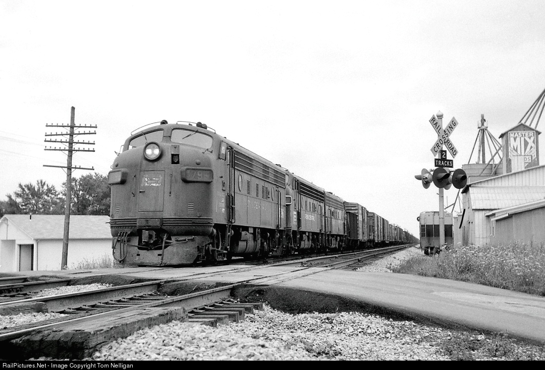 Bound for Cleveland, a trio of Penn Central F7s lead an eastbound freight at La Grange, Ohio, on the ex-NYC Big Four line from St. Louis.