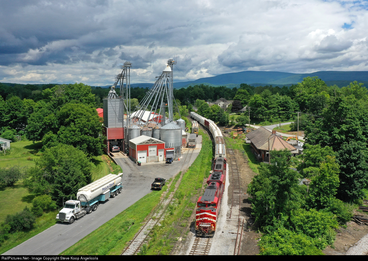 | The Vermont Railway Rutland to North Bennington job (B&R) Arrives at N Bennington yard with the VTR 432 and 303. The Poulin Grain facility storage towers are in the background. |