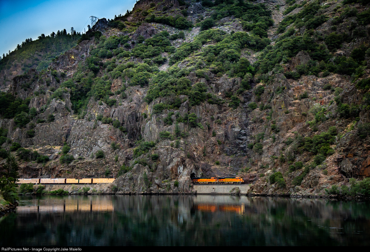 | As the sun sets behind the mountains and the blue hour nears, a BNSF run-through manifest train skirts between the beautiful rock-cut mountains and the glassy Rock Creek Reservoir inside the famed Feather River Canyon. |