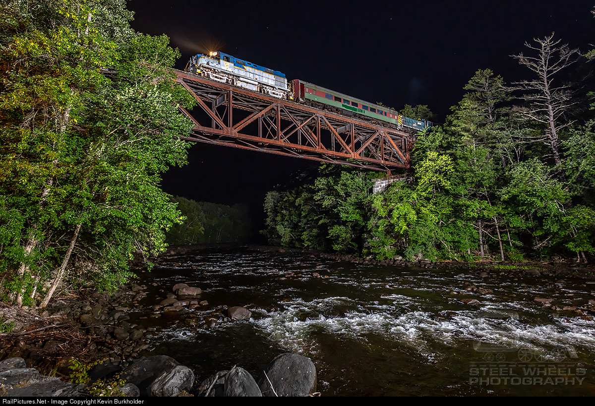 Late in the day on July 18, the famous Alco S1 Shop switcher, #5, was fired up for a trip over the entire former Saratoga & North Creek Railroad property. The move was made to 'rescue' the privately-owned ex-D&H Alco RS-36 5019 and a passenger car at North Creek, NY. The rescue operation is crossing the Sacandaga River just south of Hadley, NY at nearly the stroke of midnight. The doors on the loco hood had been open for subsequent shots and not until last shot were they closed.