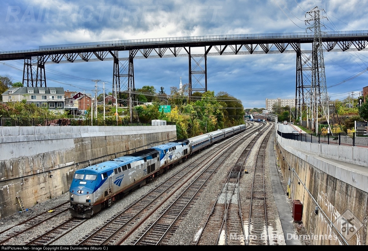 Northbound Amtrak #291 Ethan Allen Express for Rutland - Vermont after leaving the station is seen passing under the massive Poughkeepsie Railroad Bridge of the disappeared Maibrook Line of the New York, New Haven and Hartford Railroad, currently part of the pedestrian route "Walkway over the Hudson". First opened in 1889, the Poughkeepsie Bridge was the longest cantilevered and truss span bridge in the world, and created the only Hudson river crossing between New York City and Albany. Ownership of the bridge passed through several railroads including the Central New England Railway (CNE), New York, New Haven & Hartford Railroad (NH), Penn Central (PC) and Conrail. It was taken out of service on May 1974, after it was damaged by fire. It was reopened on October 3, 2009 as a pedestrian walkway as part of the new Walkway Over the Hudson State Historic Park, "the longest elevated pedestrian bridge in the world".