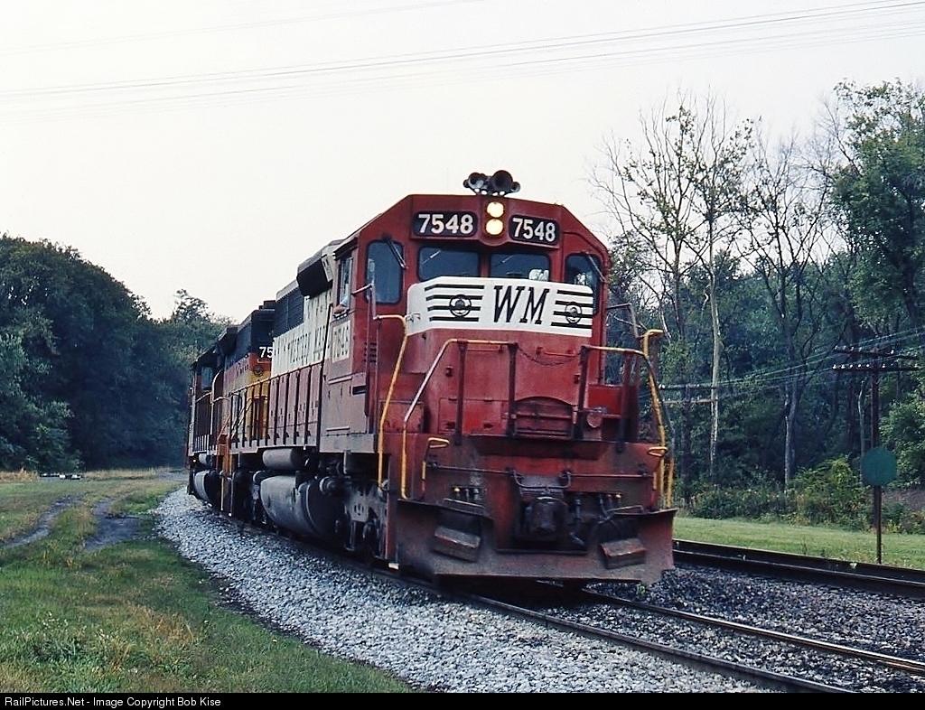 | A 1969-built Western Maryland SD40, still in its colorful "Circus Scheme," leads a westbound at Point of Rocks on the old B&O Metropolitan Subdivision |
