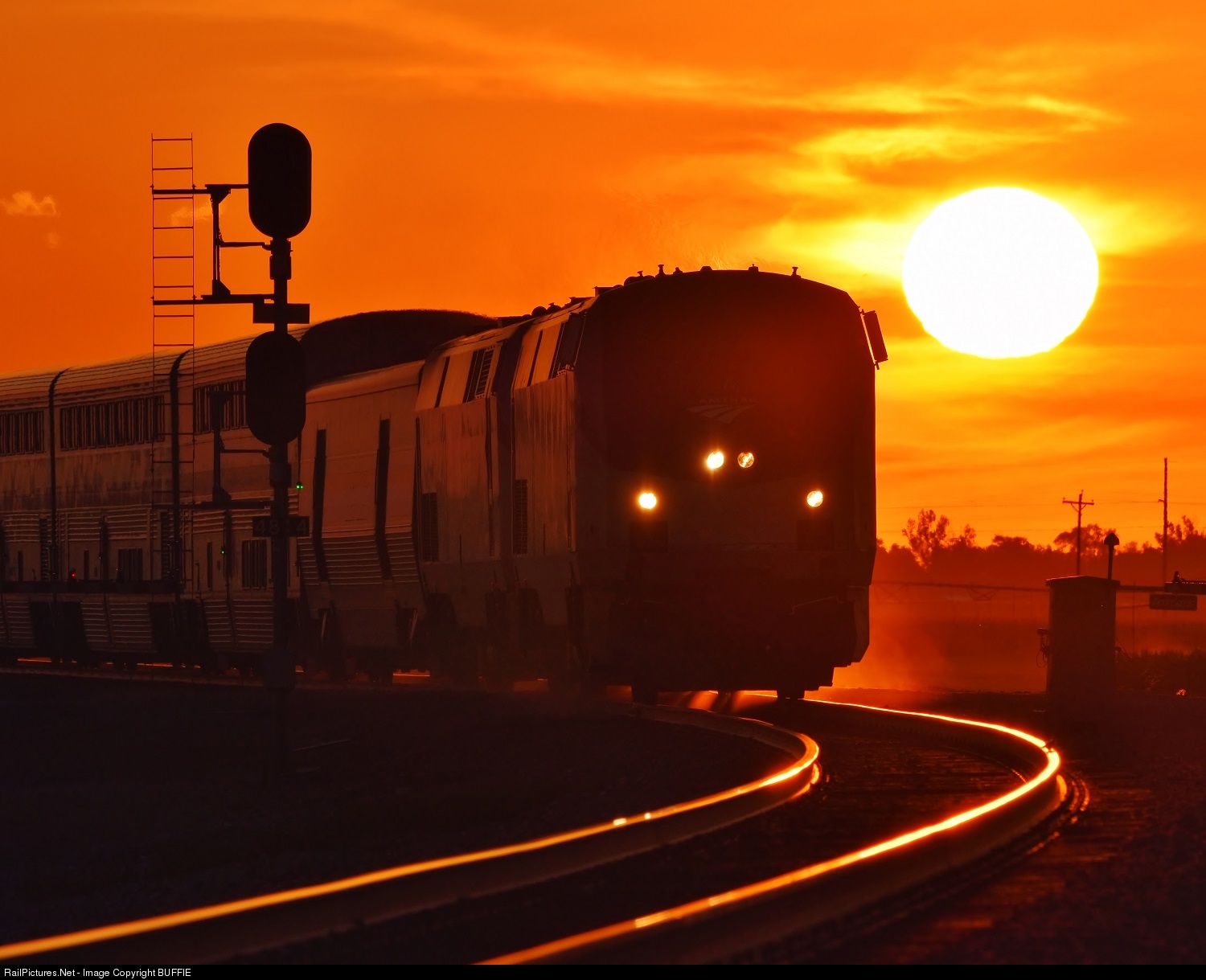 | A beautiful Colorado sunrise and the arrival of the California Zephyr come together with perfect timing in Wiggins, Colorado, positioning the orange ball on the nose of the Genesis engine as it rounds a corner west of town. |