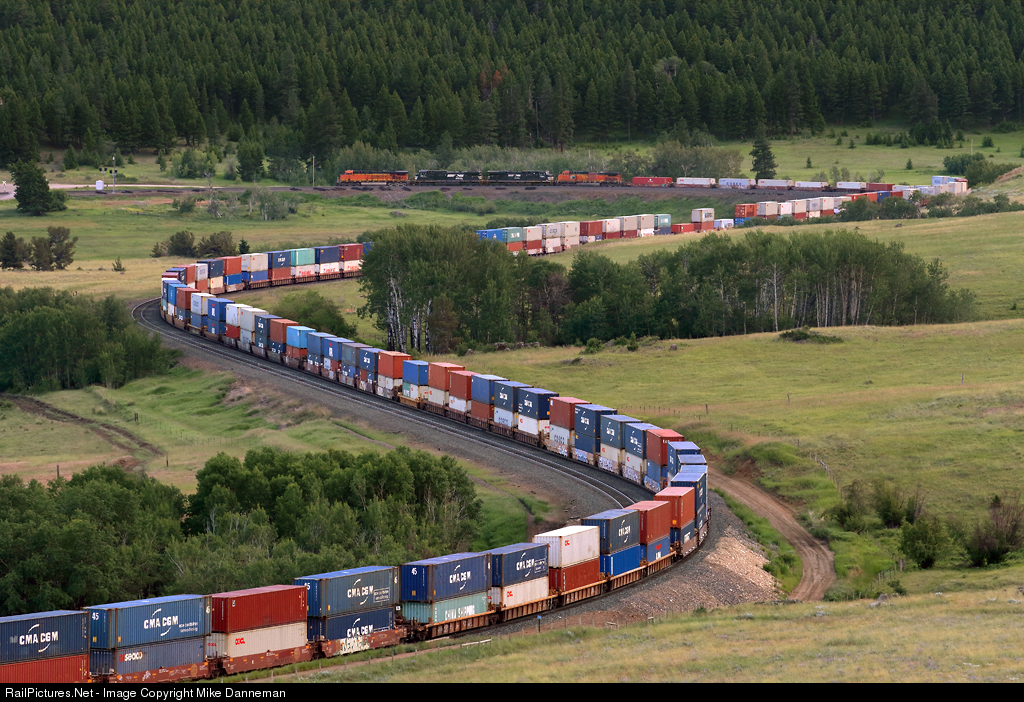 Powered by a pair of BNSF GEs bracketing a pair of Norfolk Southern units, an eastbound BNSF stack train snakes into Austin, Montana, while descending Montana Rail Link’s route over Mullan Pass on July 1, 2020.