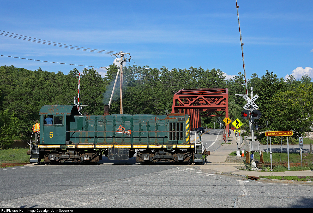 Alco 5, one of the plant switchers that was used at the Alco plant in Schenectady, crosses NY Rt 8 while running NB to North Creek on the former D&H Adirondack Branch. The Rt 8 bridge over the Hudson River is in the background. This location is known as Riverside on the RR. The 5 is headed to retrieve some equipment and move it south. This is the first train to North Creek since Saratoga & North Creek (Iowa Pacific) pulled out of this operation in 2018 amidst financial issues. The last SNC train out of North Creek was September 7, 2018. NOTE: Crossing protection out of service due to status of line. All crossings were protected by flaggers.