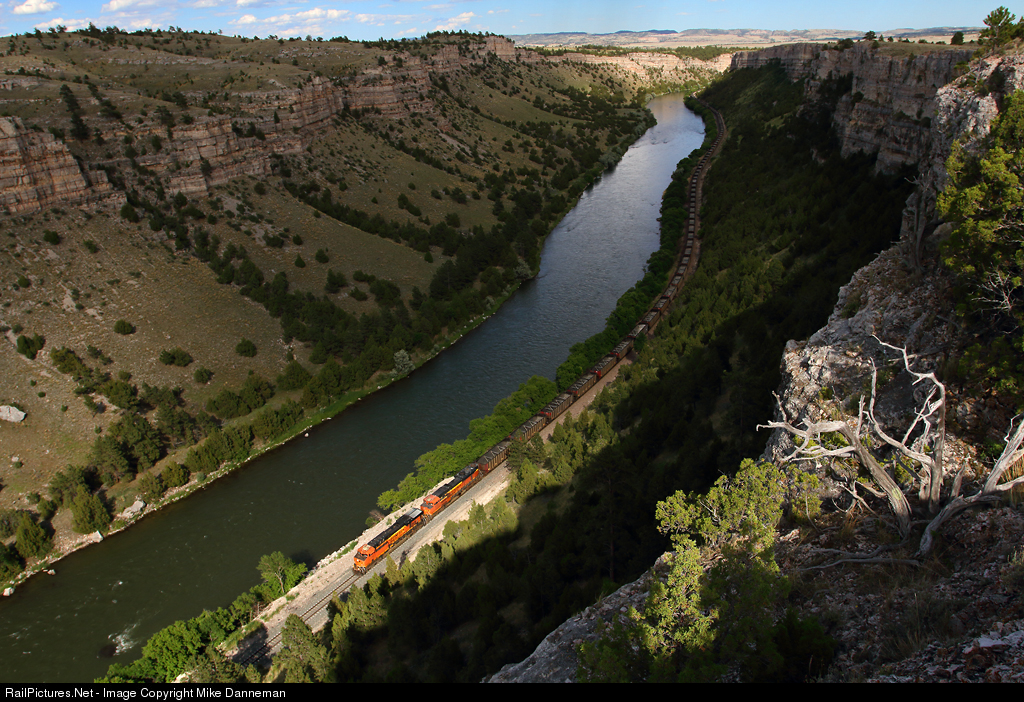 With more clouds moving in on the afternoon of June 20, 2020, a fortuitous splash of sunlight lights up the head end of a westbound BNSF coal empty rolling through Wendover Canyon west of Wendover, Wyoming. This scenic canyon made by the North Platte River is on BNSF’s aptly-named Canyon Subdivision.