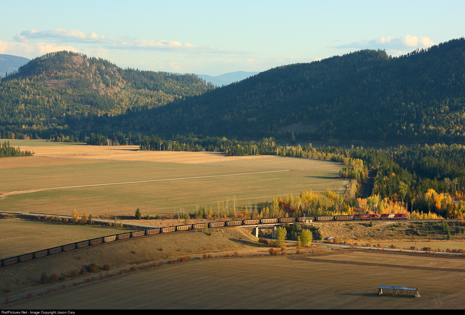 Vancouver Olympic CP8876 muscles a coal train into the setting sun at Notch Hill, BC. The Huge 10 degree Horseshoe at Notch hill was part a massive 1970s-80s grade relocation project that lowered the transcontinental mainlines westward ruling grade to 1%. The lower approach to the horseshoe can be seen above the power.
