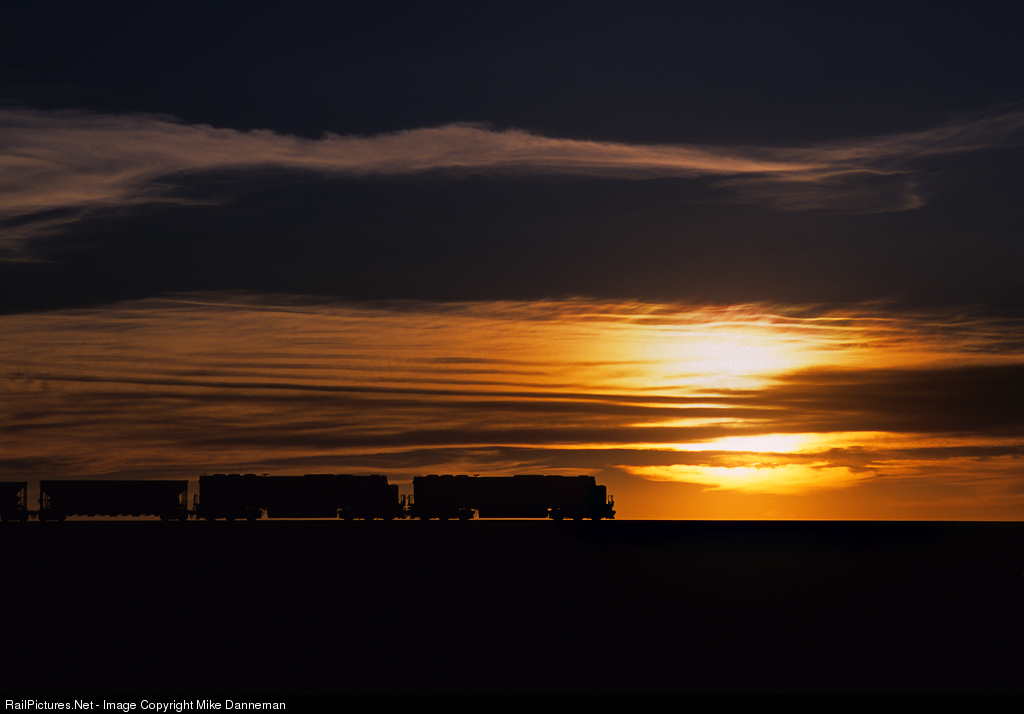 The sun is setting in Wyoming’s Powder River Basin as a BNSF coal empty heads northbound south of Bill under a fiery western sky as the day ends on May 29, 2009.
