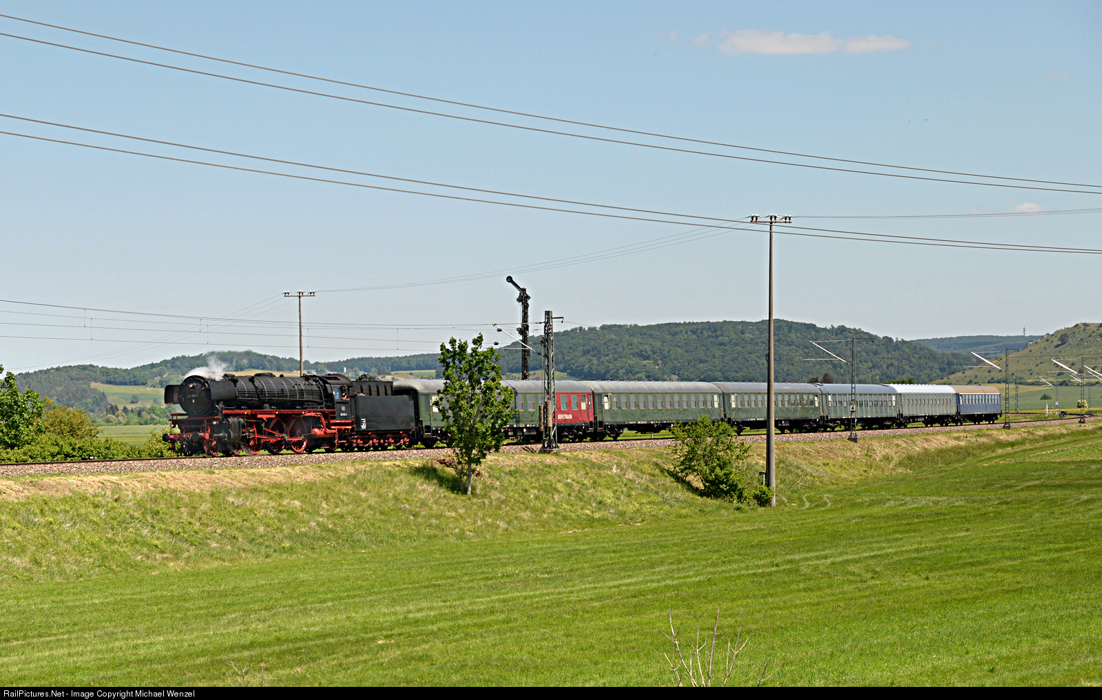 | 001 180 -9 heads north " towards the Village "Möttingen". The Train is on the way from Donauwörth back to Nördlingen and has just passed the home Signal of the Station "Möttingen", it is still asemaphore. The locomotvie is on a test run from Nördlingen to Donauwörth and back after some reconstruction work. Fortunately BEM used this test run for a foto event, very welcome, because all former special shemes this spring were cancelled due to Covid Pandemie. |