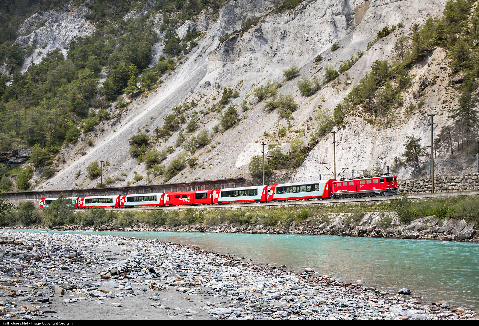 On the Swiss National Day, Ge 6/6 II # 702 "Curia", oldest operational of the series and built in 1958, is pulling the PE 902 GLACIER EXPRESS Zermatt-St.Moritz along the Vorderrhein through the Ruinaulta, between Versam-Safien and Trin. The locmotive was in charge from Disentis via Chur-Thusis to St.Moritz. The Ruinaulta was formed after the Flims landslide almost 10,000 years ago. At that time, more than 10 billion cubic metres of rock broke off between the Flimserstein and the Piz Grisch and buried the Vorderrheintal between the present-day villages of Castrisch and Reichenau under a mass of debris several hundred metres thick. Since the Vorderrhein could no longer drain away, a lake was dammed over a length of about 25 km. In the course of time, the river cut deeply into the landslide masses and the resulting lake could drain away completely. What remained was the Ruinaulta with its steep limestone scree cliffs in imposing erosional formations.