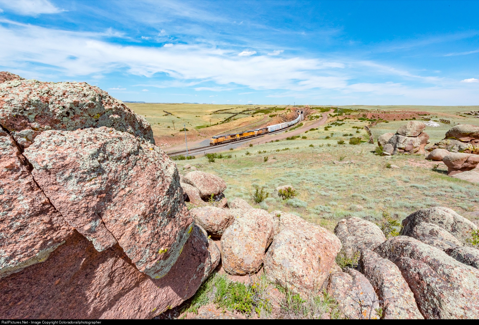 Westbound out of the Hermosa Tunnels into Tie Siding on an early June evening UP #5263 leads a diverse manifest. The Sherman Granite is rich in epidote, a green mineral, and lichens together with the red feldspar imparts to it a mottled red and green color. Although hard when unaltered the Sherman granite breaks up readily into a coarse gravelly soil under the influence of heat, cold, and the action of water, so that it forms smooth, round hills. Where the rock is firm it weathers along widely spaced joints and forms heaps of rounded bowlders. These bowlders are like great faces, rock people, one even called in mythos the Pink Panther.