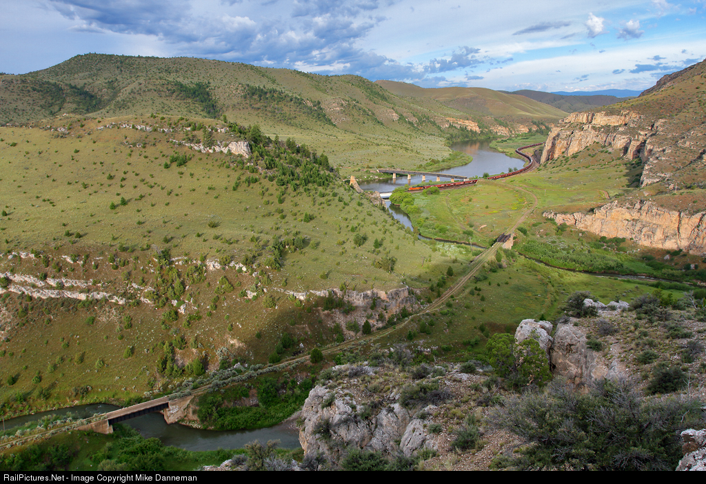 Milwaukee Road’s Pacific Extension main line crossed the Missouri River at Lombard and began the climb following Sixteen Mile Creek through appropriately-named Sixteen Mile Canyon, eventually reaching the crew change point of Harlowton and the end of electrification. In this view above the former townsite of Lombard on the morning of June 25, 2020, the abandoned Milwaukee grade crosses Sixteen Mile Creek twice on small bridges, while in the background, an eastbound BNSF grain train passes by the empty curved bridge over the Missouri.