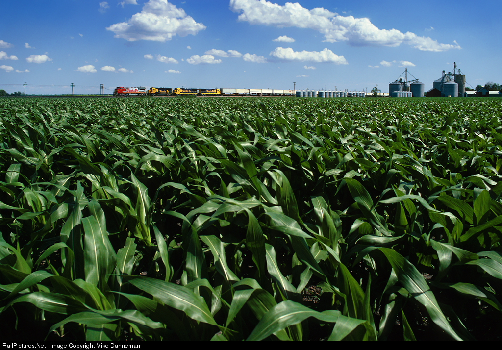 | Passing fields of young corn plants, a Santa Fe intermodal train sprints eastbound out of Ancona, Illinois, on June 26, 1993. |