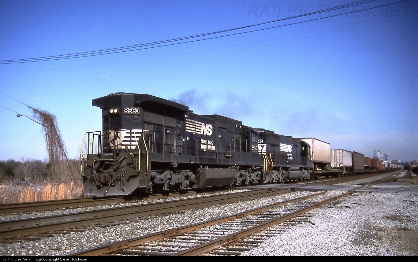 | Running long hood forward, in N&W and Southern tradition, NS 8560 highballs a TOFC train southbound through High Point. |