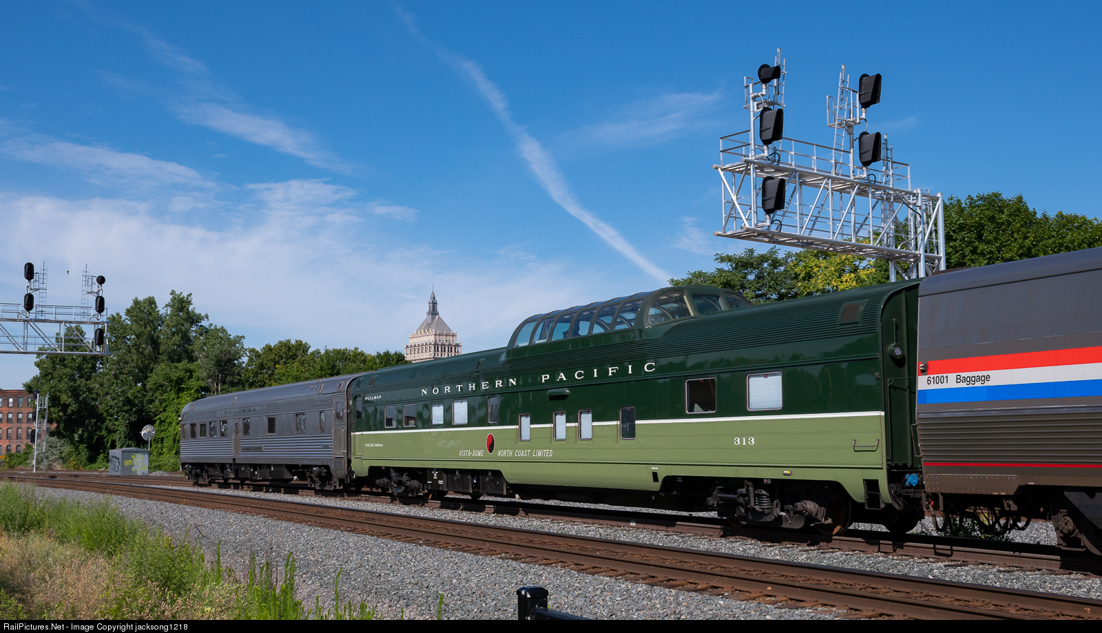 | On a sunny August morning, Amtrak train 48 the "Lakeshore Limited" rolls into Rochester's Louise Slaughter Amtrak station right on time with a pair of Webb Rail railcars bringing up the rear of the train. The first car is Northern Pacific Railway Budd Pullman dome/sleeper 313 (WEBX 801044) and former New York Central Railroad Budd Pullman observation/diner/sleeper "Babbling Brook" (WEBX 800007). |
