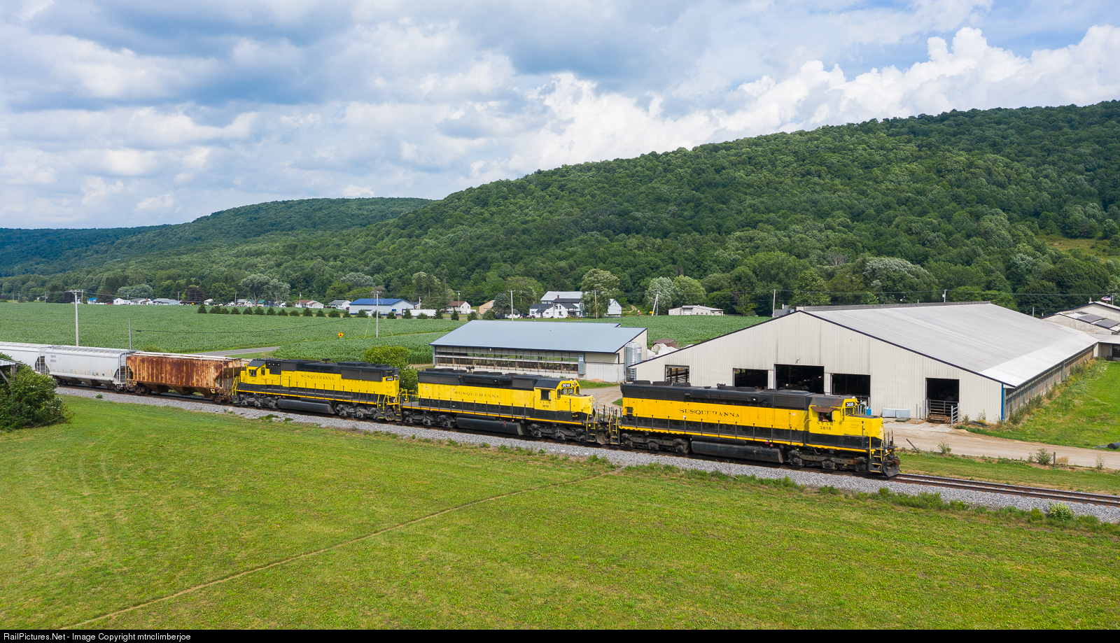 New York, Susquehanna & Western's CL-1 from Syracuse cruises through a fertile agricultural valley in Little York, New York. SD45-2 3618 leads the way as the train passes by dairy barns and hay fields.