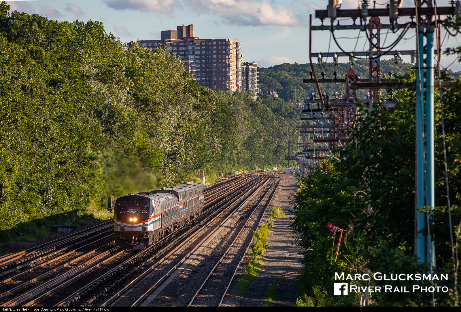 Operate Looking Out. Tropical Storm Isaias passed through the New York metropolitan area on Tuesday, August 4, 2020, causing havoc on the area's railroads. Amtrak 49 (Lake Shore Limited) departed New York's Penn Station just under three hours late (P32AC-DM 707, Phase III leading), unusually permitting a little bit of sun on the nose as it passes through CP 12 in the Bronx, NY near the Metro-North Riverdale Station on Track 2. The scene is framed by the unique New York Central power supports.