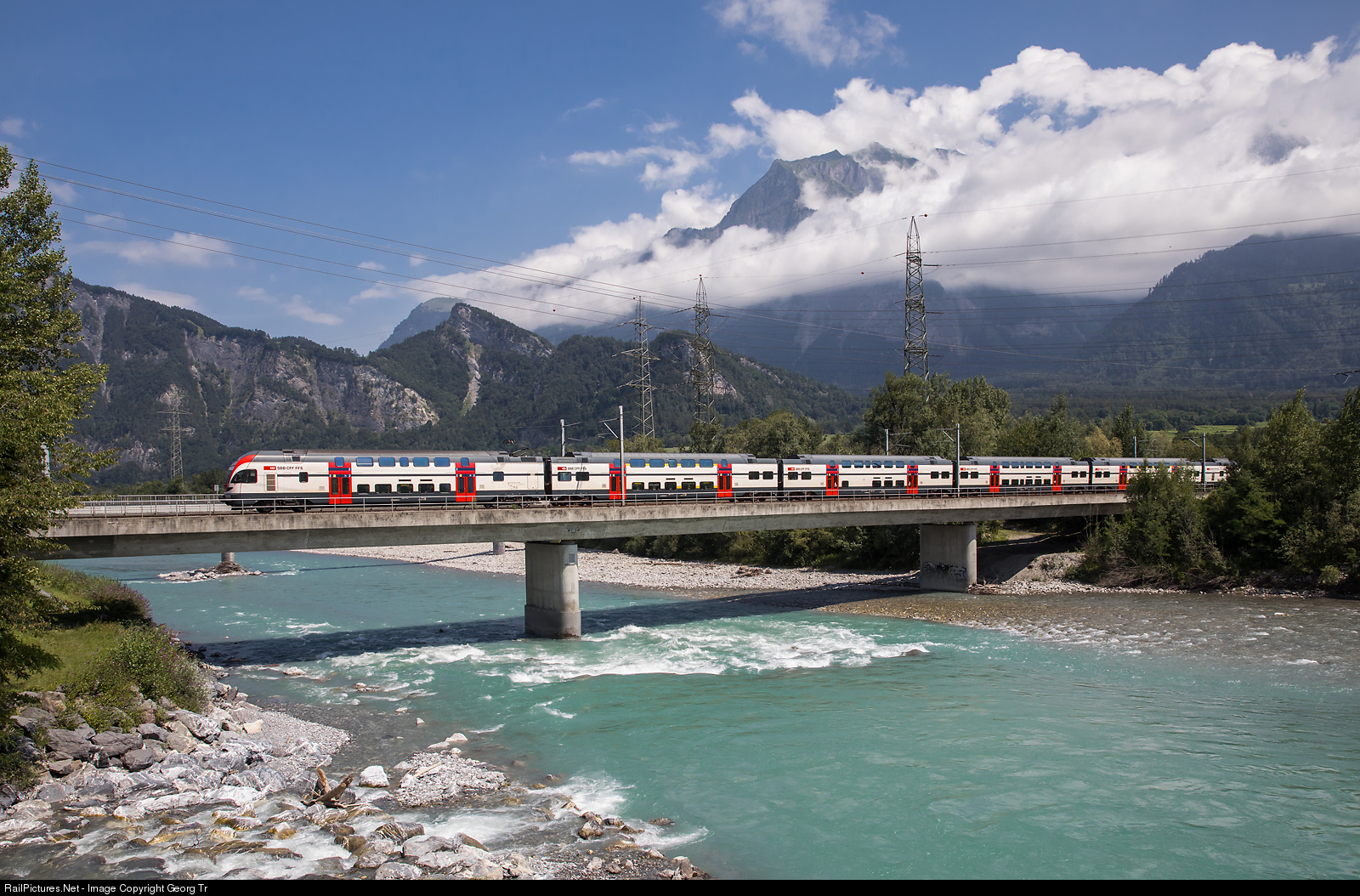 | Six car doubledeck train RABe 511 # 0.. of the SBB is running the Regio Express 3470 from Chur via Landquart-Sargans-Ziegelbrücke-Pfäffikon SZ-Wädenswil-Thalwil to Zürich, crossing the Rhine between Maienfeld and Bad Ragaz, with the Falknis mountain in the background. |