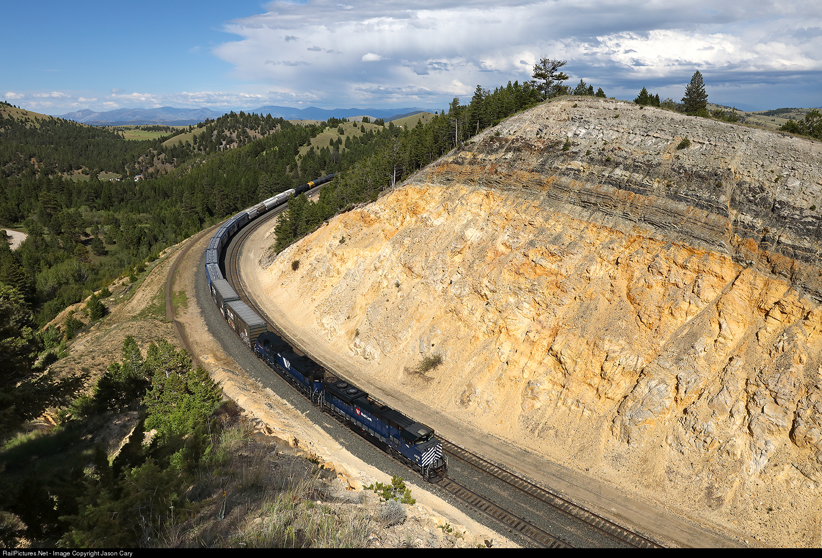 MRL4400 leads a long heavy Laurel-Missoula manifest into the large cut at Iron Ridge. The heavy westbound manifest has a manned 4 unit set of MRL SD70ACEs shoving mid train to move the tonnage up the 2.2%. The cut bypassed a tunnel, and was recently widened to accommodate extending the siding to Weed.