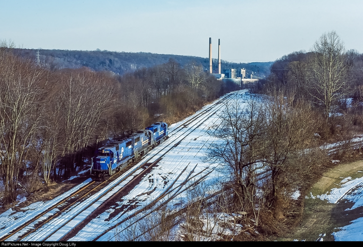 | The crew of Conrail train UPS has dropped their train of coal at Metropolitan Edison’s Portland Generating Station, seen in the distance, and is now headed for the Portland Diner to get a bite to eat. The power is westbound on the pre=Lackawanna Cutoff DL&W old main line. In the right distance and right foreground are two legs of a wye that lead to the Bangor & Portland Subdivision. |