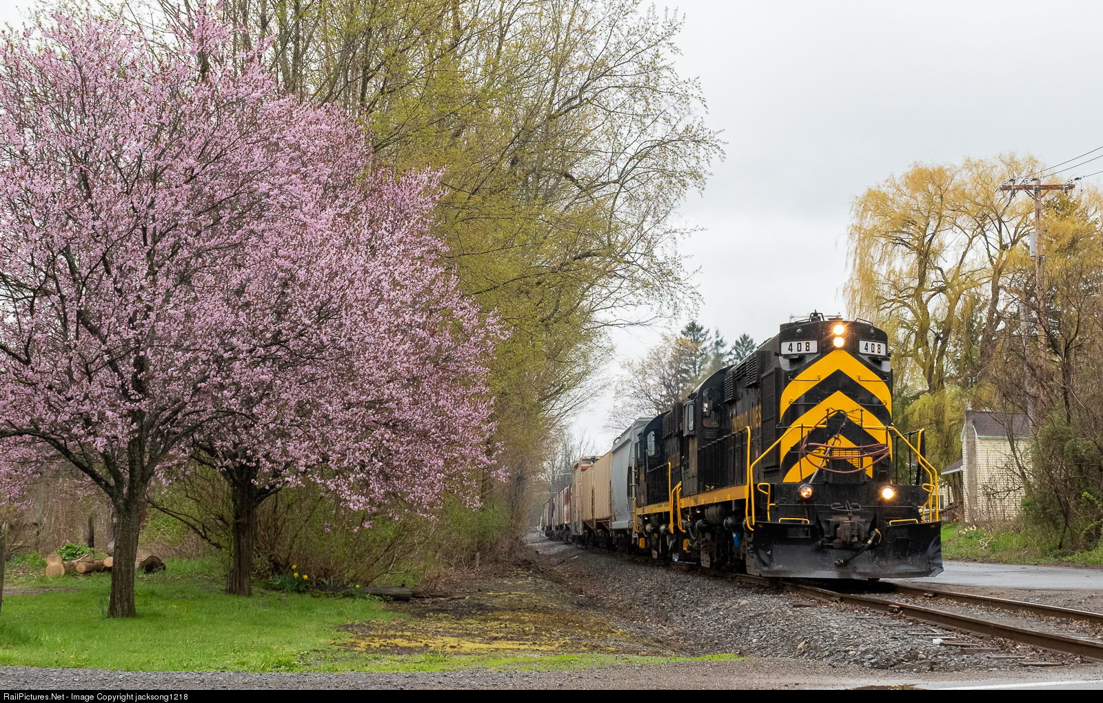 Ontario Midland ALCos 408 (RS-36) and 36 (RS-11) haul 11 cars north through Sodus Center, NY on a dreary spring day in Upstate NY. The train is on the ex PRR Sodus Bay Branch, and will shortly turn west onto the ex NYC Hojack for the final miles into Sodus.