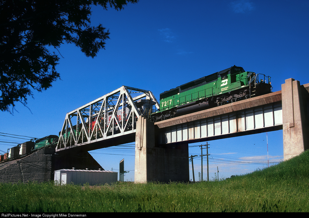 On July 4, 1999, a northbound Burlington Northern Santa Fe rumbles over the bridge spanning Union Pacific’s busy main line at Cheyenne, Wyoming. This location is on BNSF’s Front Range Subdivision from Denver, Colorado, to Wendover, and is a former Colorado & Southern route