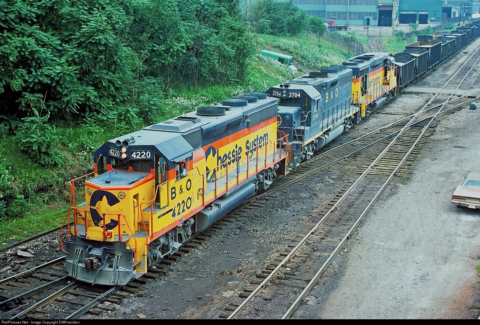 | A westbound Chessie System freight led by GP40-2 4220, GP40 3704 and GP30 6913 rolls through the Center St. crossing in Youngstown, OH. |