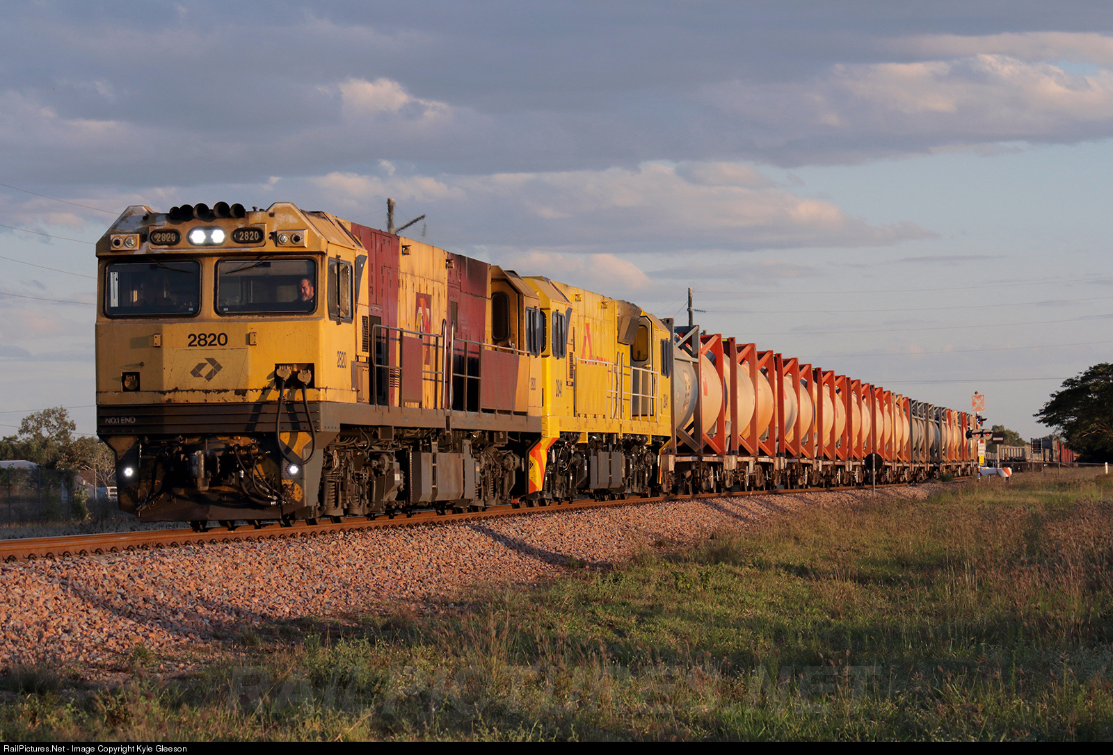| Old and New. The last Bronco 2800; 2820 and recently overhauled canary 2841 trundle out of Woodstock working 9255 Mount Isa to Townsville Mineral Freight after crossing Pacific National 9M30 |