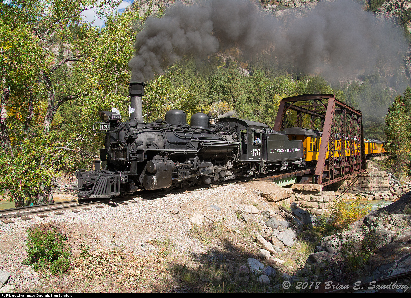 | D&SNG K28 #476 with the 2018 Fall Photographer's Train en tow, crosses the Animas at Tefft, CO 9/23/18. |