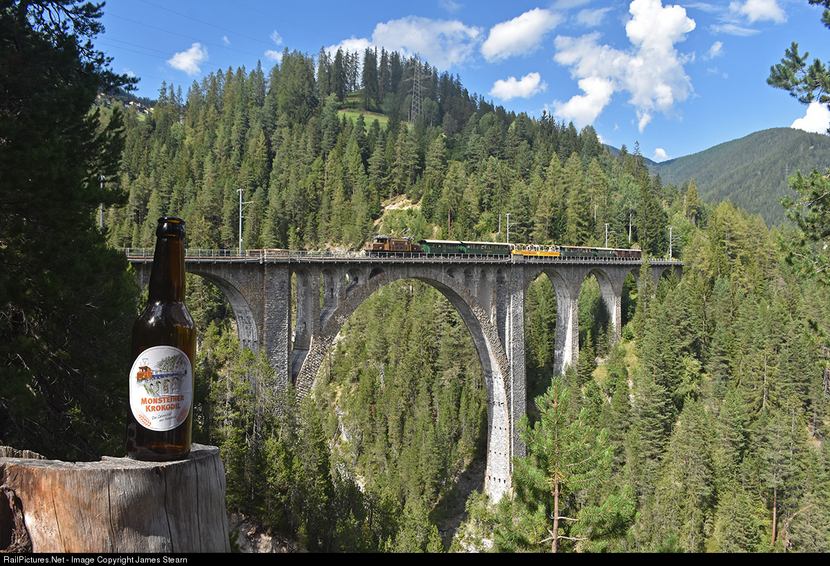 'Rhaetian Crocodile' Ge 6/6 I number 415 is in charge of the summer tourist service between Davos Platz and Filisur. The train is popular with tourists and is even epitomised in a bottle of beer sold by the bar on the station at Davos Wiesen. The scenery hides the fact that this viewpoint is just a short, easy walk from the station - however not a route for those with a fear of heights as it involves traversing the walkway platform attached to the side of the viaduct with an 88.9m drop to the Landwasser below!