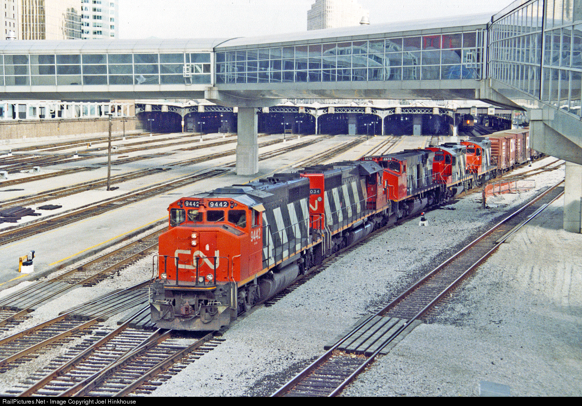 | Rolling in from the east, around the south side of the Toronto Union Station train sheds, a nice mix of Canadian National power rumbles by. |