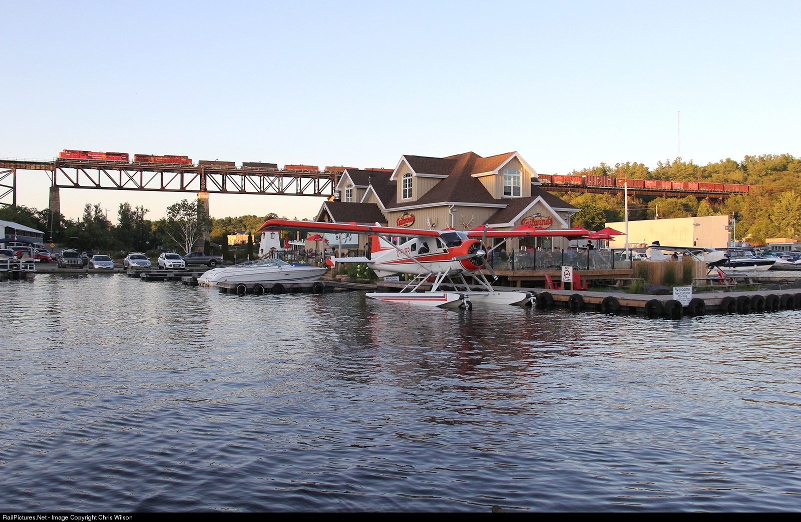 At last light many people enjoy the patio at tailwinds as Toronto - Winnipeg freight #421 crosses the massive Parry Sound trestle.