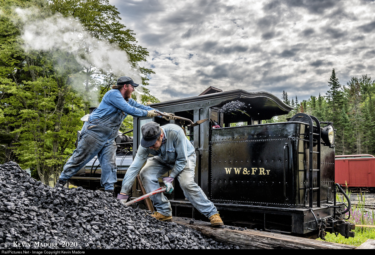 Coaling the old fashioned way....one shovel at a time. With the WW&F Museum's bucket loader broken this day, Engineman Bill Piche and Ashcat Joe Fox coal Locomotive #9 the old fashioned way....one shovel at a time. As several of us watched this operation, we couldn't help but imagine this being a re-enactment of a Monson Railroad scene, as the Monson was perhaps the most primitive of Maine's 2-foot railroads in just about every regard. Interestingly, none of the Maine 2-footers ever had anything approaching a mechanical coal tipple. The small, 24" gauge Forneys didn't hold all that much coal and were typically loaded using pulley and bucket system, so what you see here is not all that far off the mark. As noted above, under normal circumstances, the museum's locomotives are coaled using a small tractor with a front-end loader mounted on it.