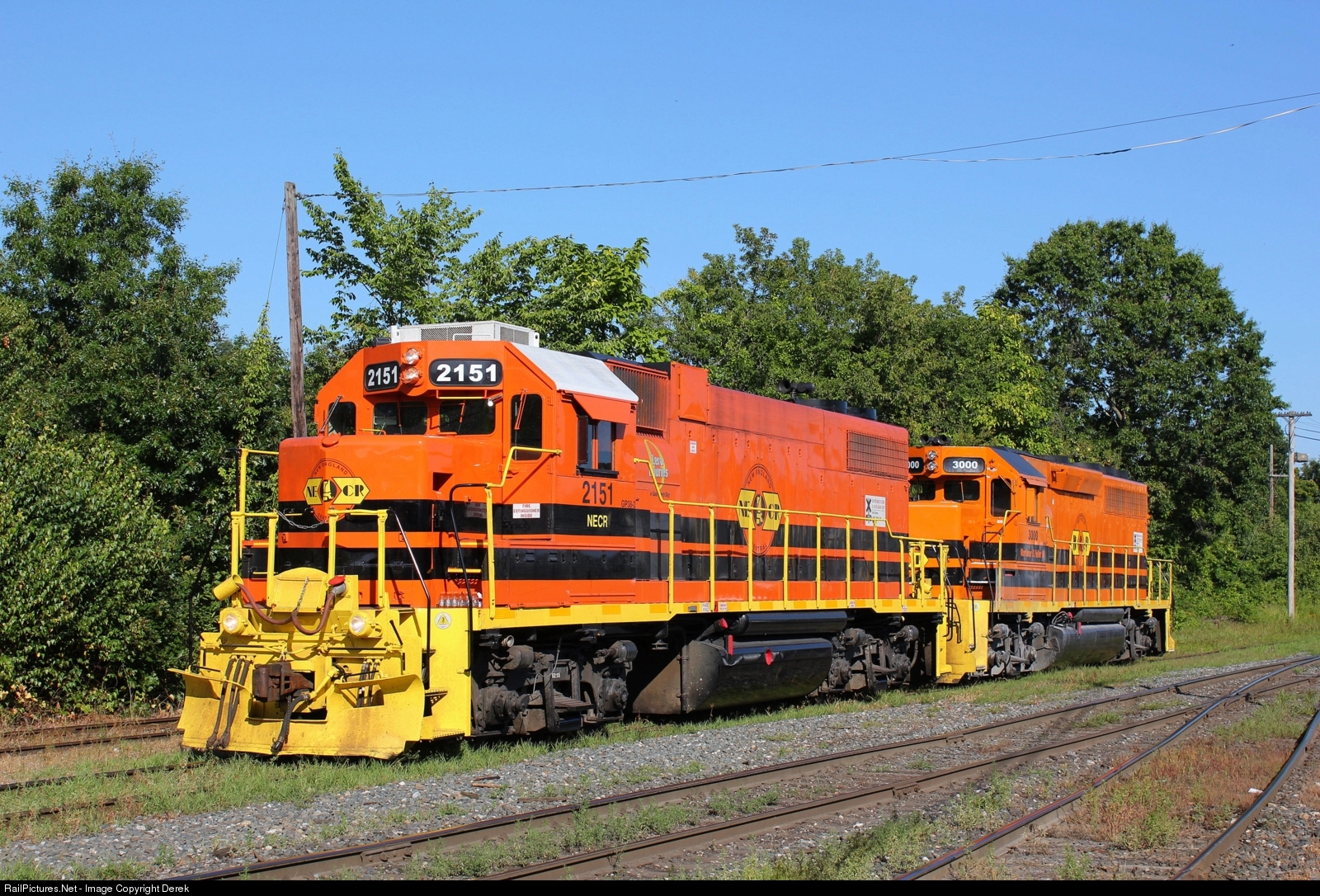 A pair of locomotives idle in the NECR Palmer yard shortly before leaving with a southbound freight train. In front is NECR 2151; in the rear is Buffalo & Pittsburgh 3000, featuring a slightly different shade of orange on its paint scheme.