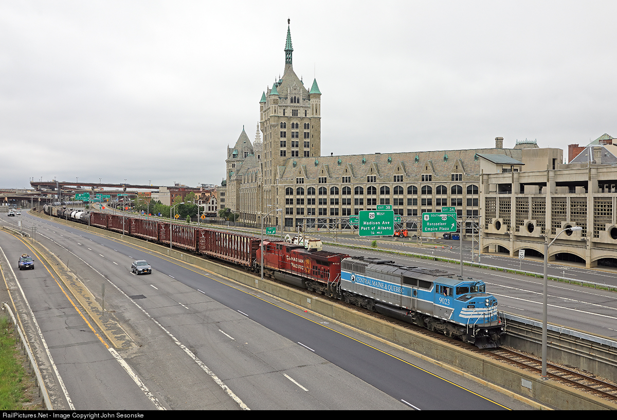 | Heavy tonnage on the Saratoga to Albany (Kenwwod Yard) turn job lead to the unusual and unexpected sight of a Central Maine and Quebec blue barn passing the historic D&H Building in downtown Albany. The unit had come down the day before from Montreal on CP 252. The original D&H Building was completed in 1915 and served as headquarters for the Delaware & Hudson Railway until the late 1970's. The tracks here are located between the NB and SB lanes of I-787. |